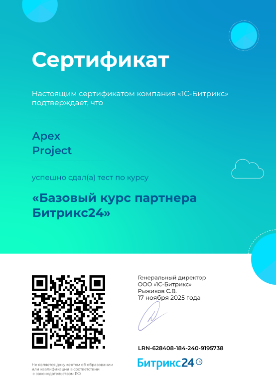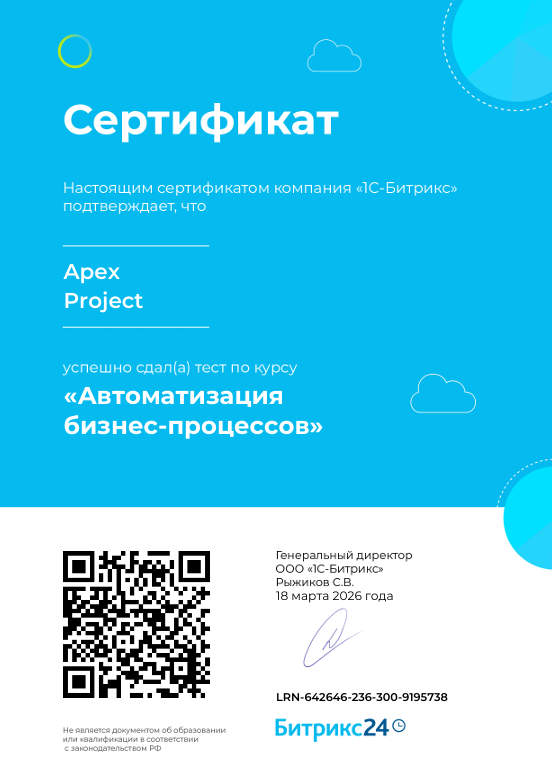 Компания АПЕКС специализируется на внедрении и настройке корпоративного портала Битрикс24, помогая бизнесу автоматизировать ключевые процессы и повышать эффективность работы. Более 3 лет успешной практики позволили сформировать команду опытных специалистов, обладающих глубокими знаниями.